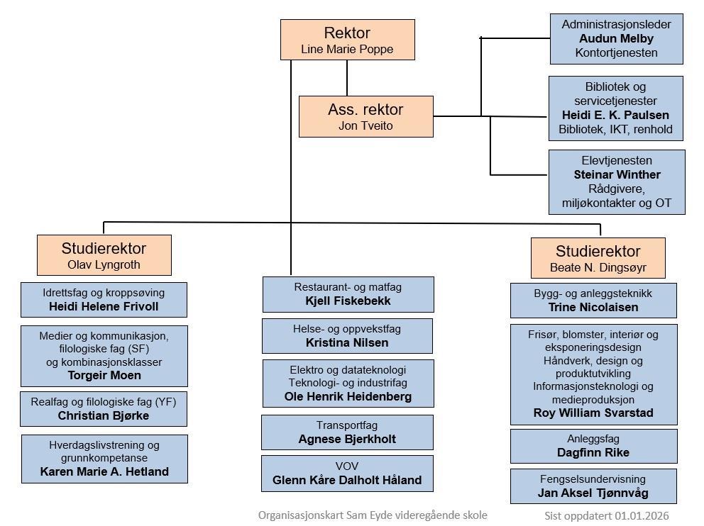 OrganisasjonskartOrganisasjonskart Sam Eyde vgs 01012026TekstversjonRektor Line Marie PoppeAssisterende rektor Jon TveitoAdministrasjonsleder Audun MelbyAvdelingsleder Bibliotek og servicetjenester Heidi E. K. PaulsenAvdelingsleder Elevtjenesten Steinar Winther Studierektor Olav LyngrothAvdelingsleder Heidi Helene Frivoll (Idrettsfag og kroppsøving)Avdelingsleder Torgeir Moen (Medier og kommunikasjon, filologiske fag (SF) og innføringsklasser)Avdelingsleder Christian Bjørke (Realfag og filologiske fag (YF))Avdelingsleder Karen Marie A. Hetland (Hverdagslivstrening) Avdelingsleder Kjell Fiskebekk (Restaurant- og matfag)Avdelingsleder Kristina Nilsen (Helse- og oppvekstfag)Avdelingsleder Ole Henrik Heidenberg (Elektro og datateknologi og Teknologi- og industrifag)Avdelingsleder Agnese Bjerkholt (Transportfag)Avdelingsleder Glenn Kåre Dahlholt Håland (VOV) Studierektor Beate Nielsen DingsøyrAvdelingsleder Dagfinn Brokka Rike (Anleggsteknikk)Avdelingsleder Roy William Svarstad (Frisør, blomster, interiør og eksponeringsdesign, Håndverk, design og produktutvikling og Informasjonsteknologi og medieproduksjon)Avdelingsleder Trine Nicolaisen (Bygg- og anleggsteknikk)Avdelingsleder Jan Aksel Tjønnvåg (Fengselsundervisningen)